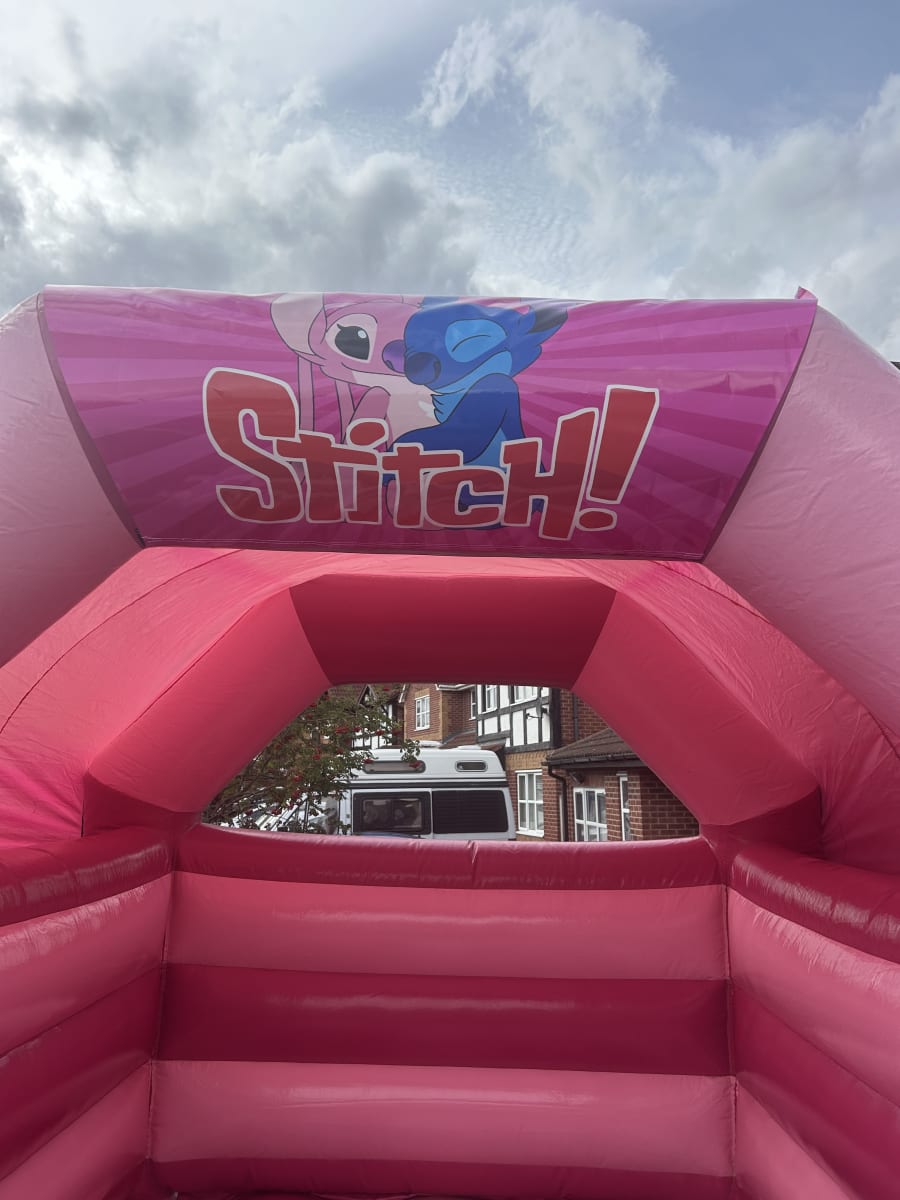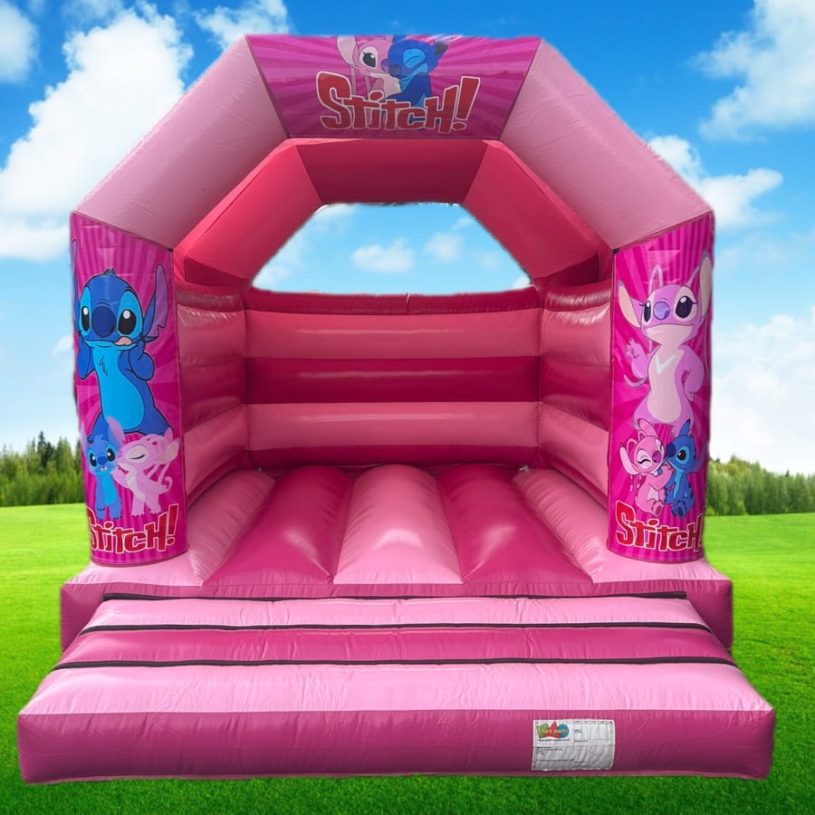 If you're searching for Stitch and angel themed bouncy castle hire 11x14 Pink Gloss Stitch & Angel Themed Bouncy Castle with Sun/Rain Cover in Wrexham, Chester and surrounding areas, look no further! Our dedicated delivery and setup service ensures a hassle-free experience, so you can focus on enjoying the day while we handle the details. We pride ourselves on reliability, safety, and exceptional customer service.
