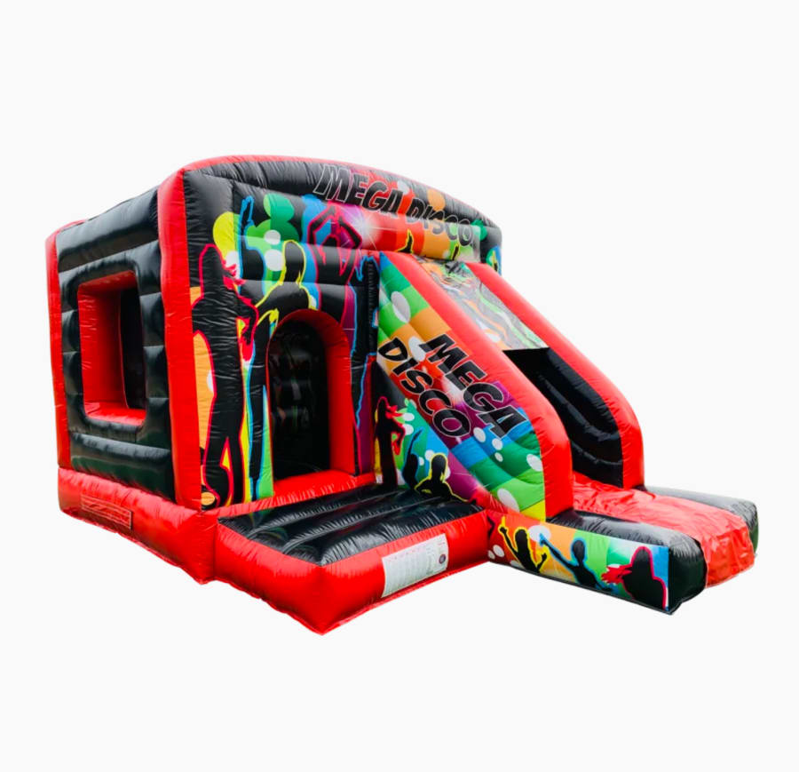 Get ready to party with the 12 x 17 Red & Black Mega Disco Bounce & Slide With Sun/Rain Cover! This inflatable bounce house and slide combo is perfect for all your disco-themed celebrations. With its vibrant red and black design, it will be the centerpiece of any event.