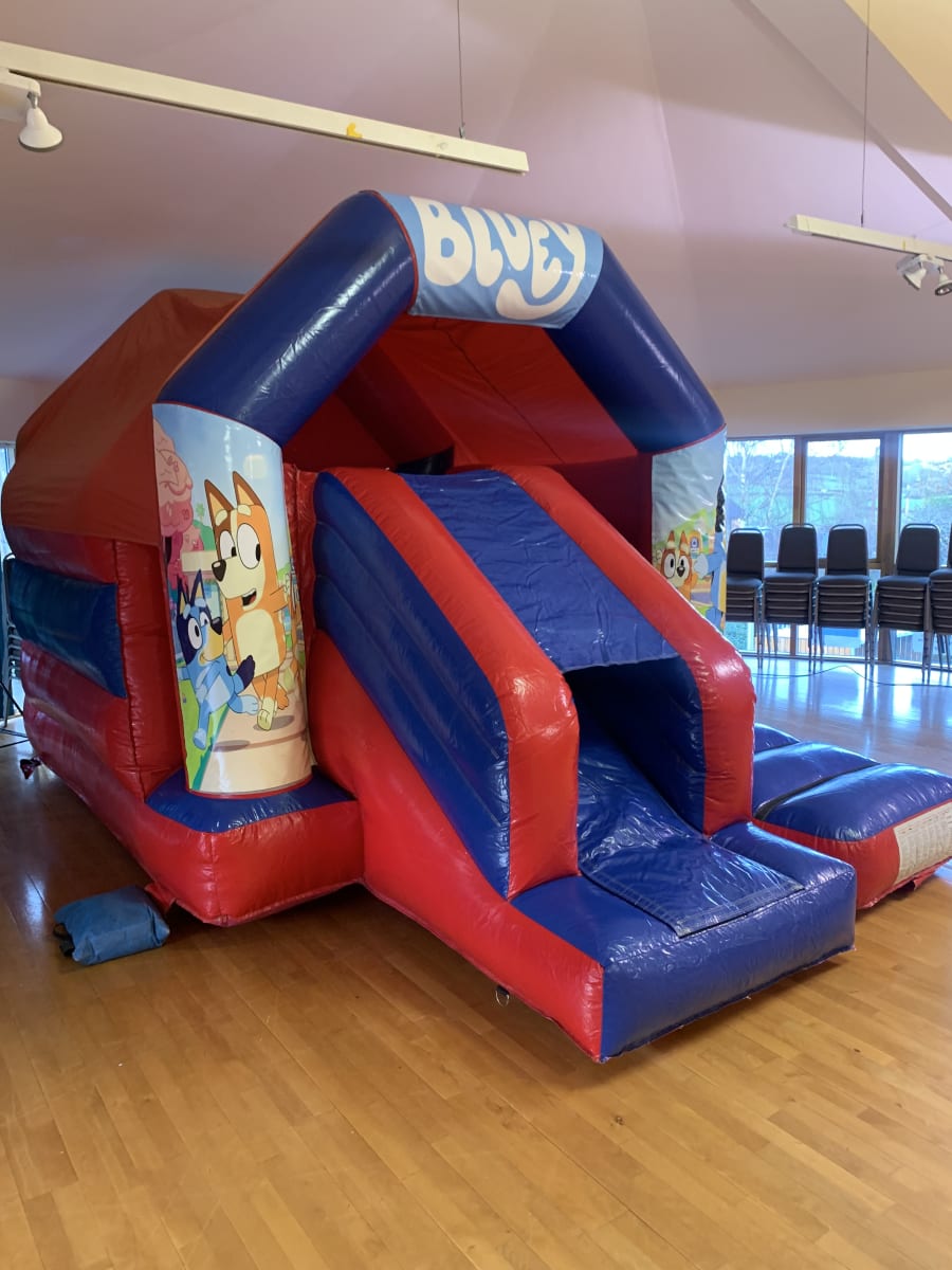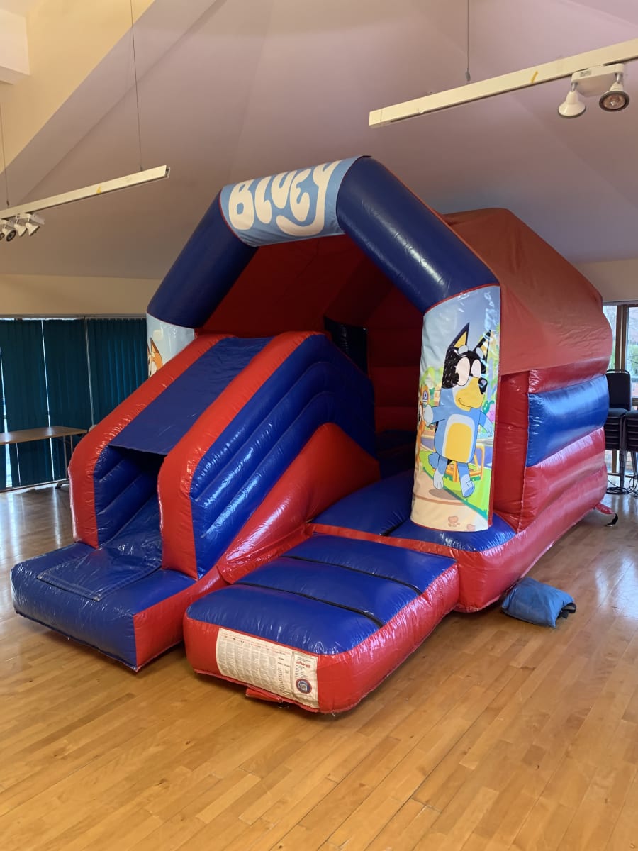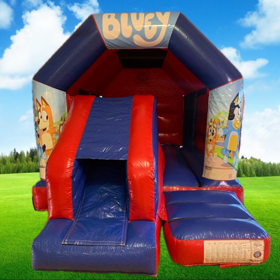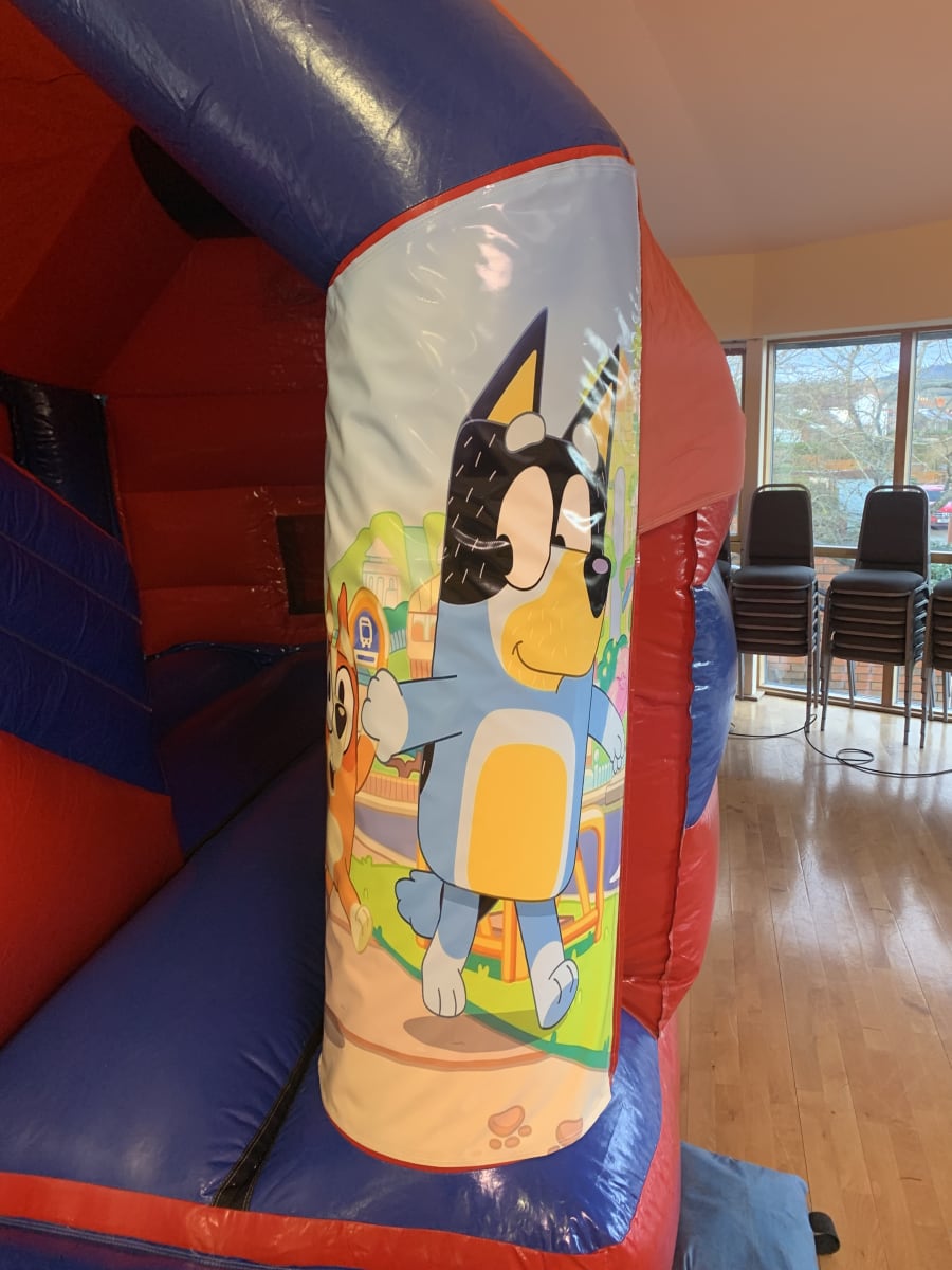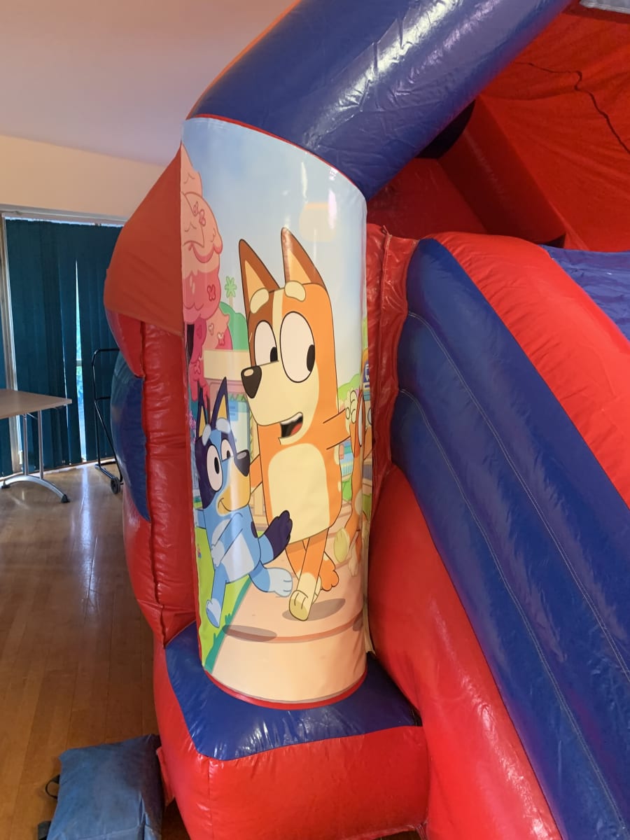 Introducing the 11 X 17 Bluey Themed Red & Blue Bounce & Slide Castle With Sun/Shower Cover, the perfect addition to any party or event! This inflatable castle combines the fun of bouncing and sliding with the beloved Bluey theme, creating an exciting and memorable experience for kids of all ages.